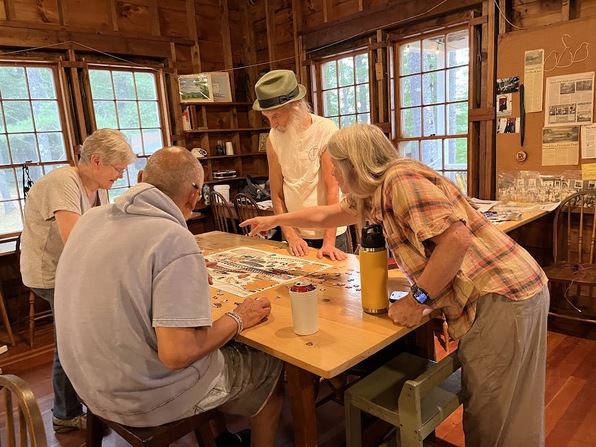 Since at least the 1980's at camp, there's been a table in the Dining Hall by the Sales Table that's used by the very informal (whoever works on it is a member) FNCA Puzzle Club. There is always a good sized puzzle — usually of 1000 or more pieces — in progress on it. And at any random time during the day or night there may be from 1 to 7 or more people working on it.